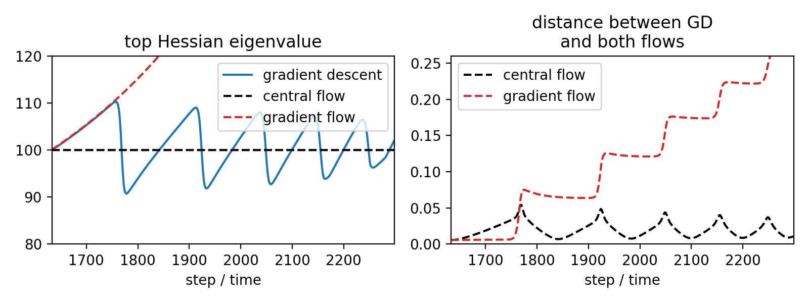 On the right, observe that the distance between the gradient descent and the central flow stays small over time, whereas the distance between gradient descent and gradient flow starts to grow large once the dynamics enter EOS. (The red line ends early because we stop discretizing gradient flow once the sharpness gets high enough that discretization becomes too challenging.)