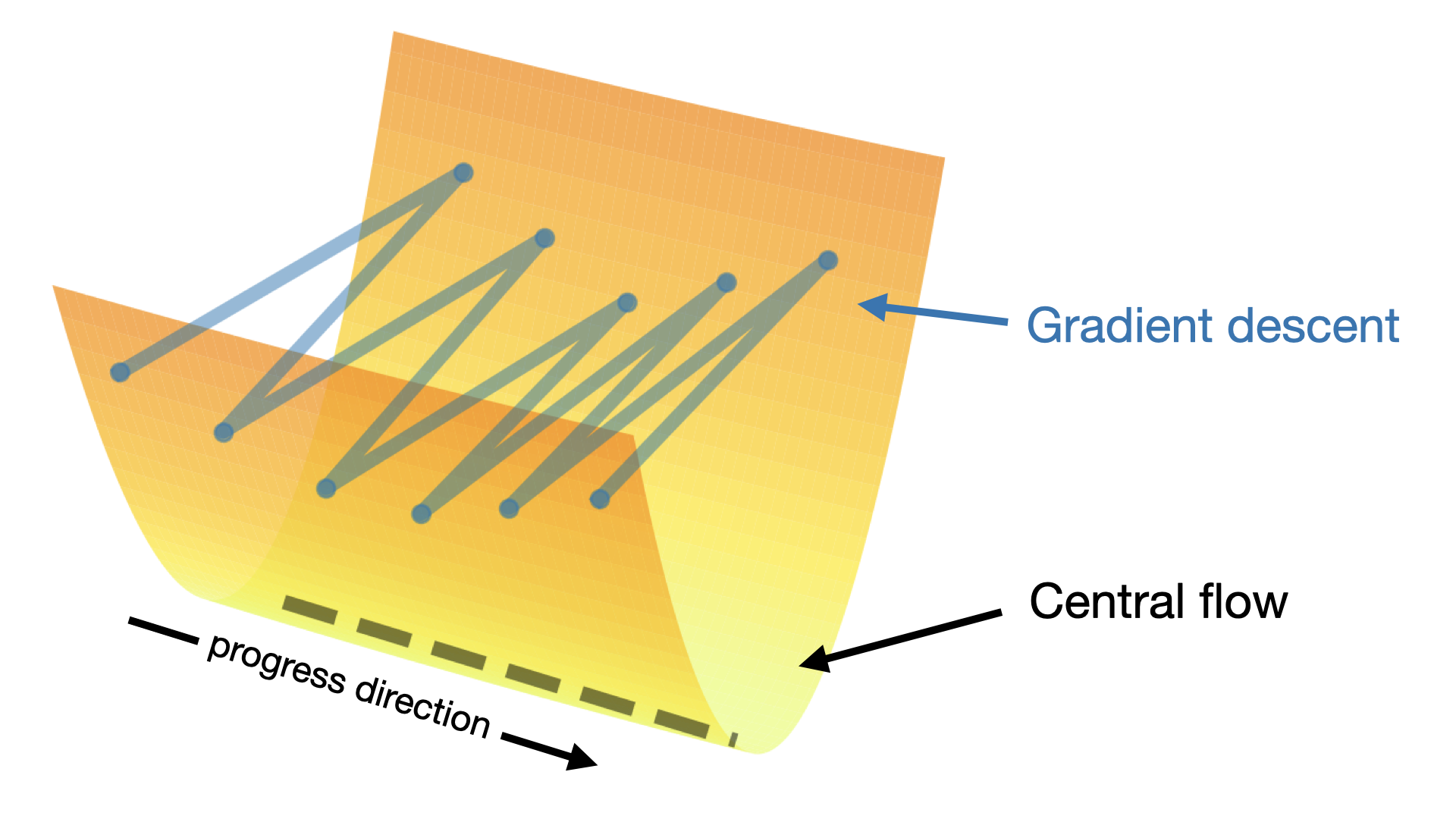 The central flow models the time-averaged (i.e. locally smoothed) trajectory of gradient descent, as illustrated in the following cartoon of the weight-space dynamics: