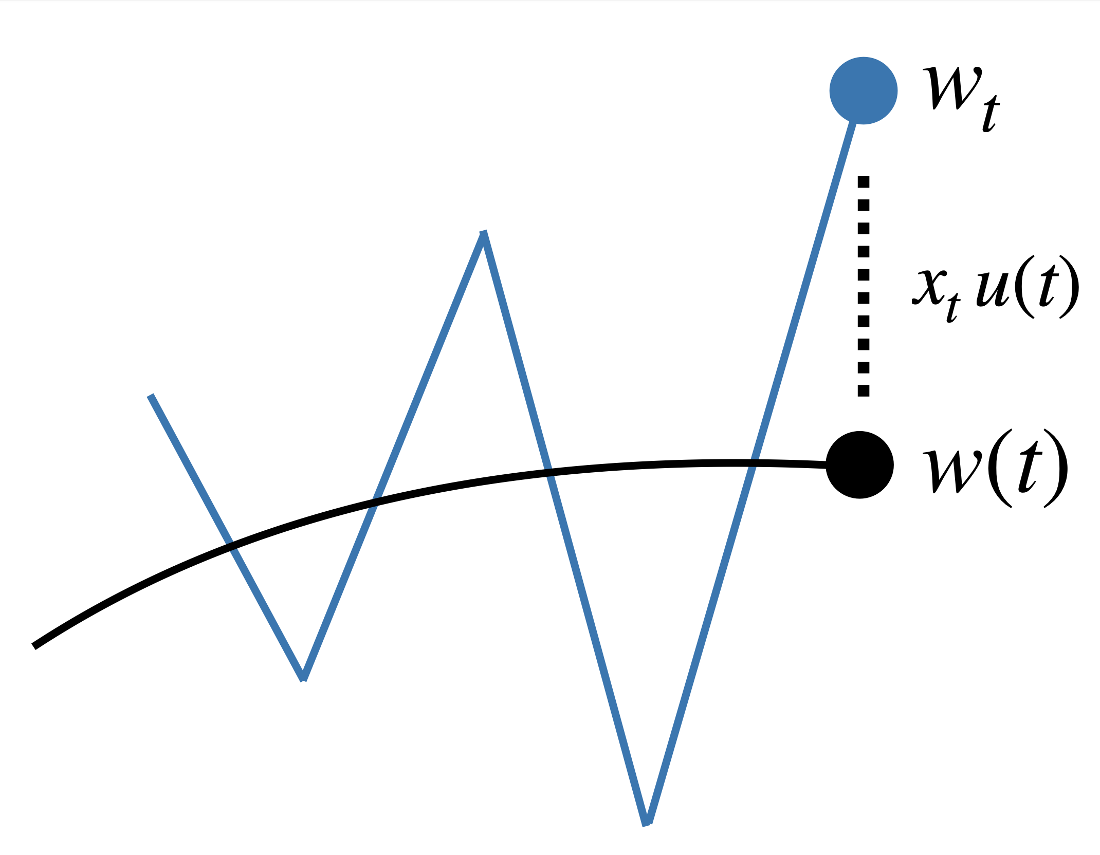 Our central flow \(w(t)\) will characterize this path. For now, let us consider the case where just one eigenvalue is at the edge of stability. As before, we model the iterate \(w_t\) as being displaced from the time-averaged iterate \(w(t)\) by some perturbation along the top Hessian eigenvector \(u(t)\) with magnitude \(x_t\):