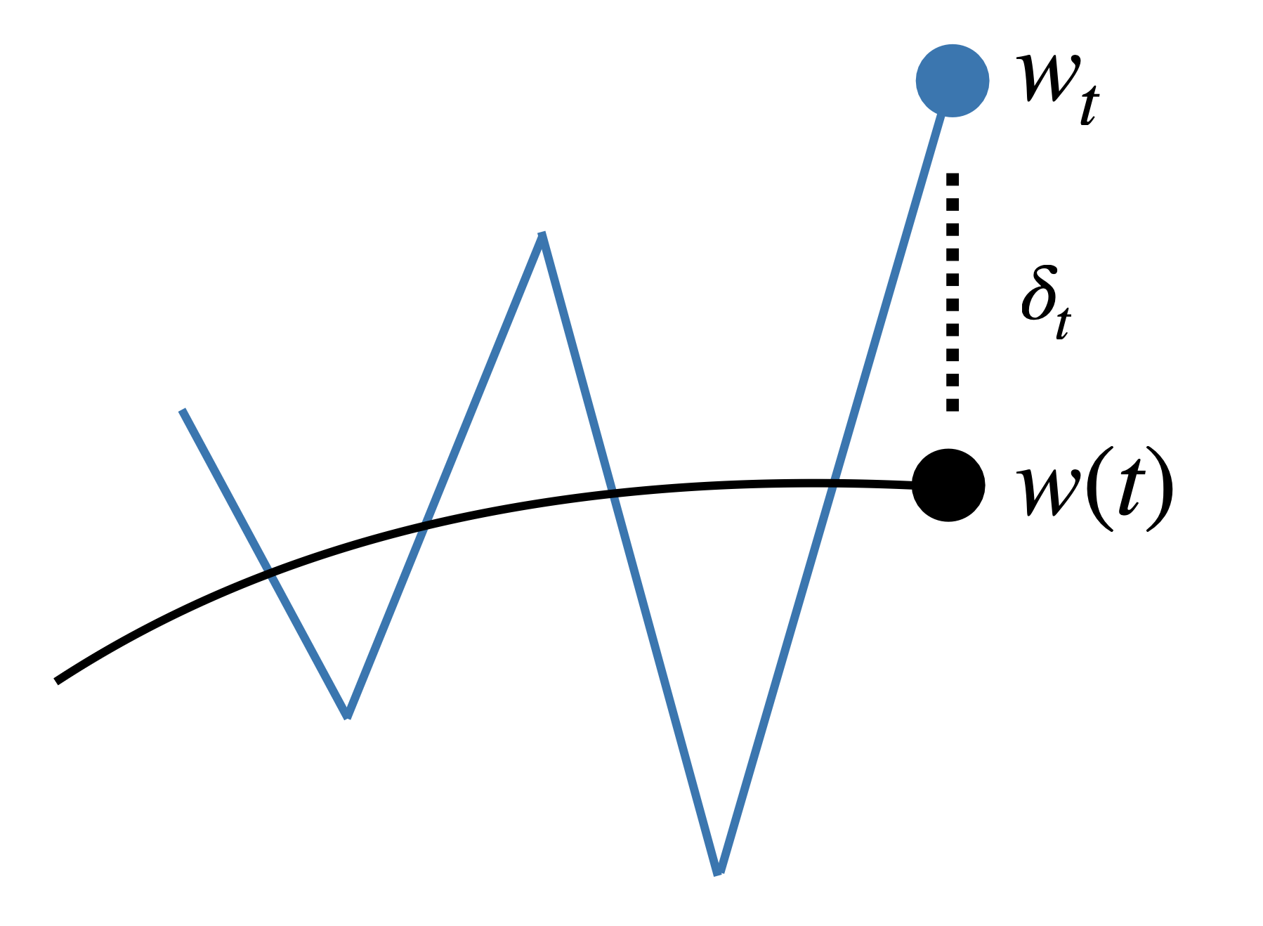Recall from Part I that the time-averaged gradient is then approximately: \[ \underbrace{\mathbb{E}[\nabla L(w_t)]}_{\color{red}{\substack{\text{time-average} \\ \text{of gradient}}}} \approx \underbrace{\nabla L(w(t))}_{\color{red}{\substack{\text{gradient at time-} \\ \text{averaged iterate}}}} + \underbrace{\tfrac{1}{2} \nabla \langle \Sigma(t), H(w(t)) \rangle}_{\color{red}{\substack{\text{implicit curvature} \\ \text{reduction}}}}, \] where \(\Sigma(t) = \mathbb{E}[\delta_t \delta_t^T] \) models the instantaneous covariance matrix of the oscillations at time \(t\).
